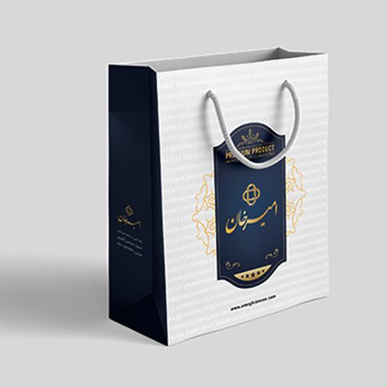 ساک دستی کاغذی گلاسه با چاپ طلاکوب برند امیرخان